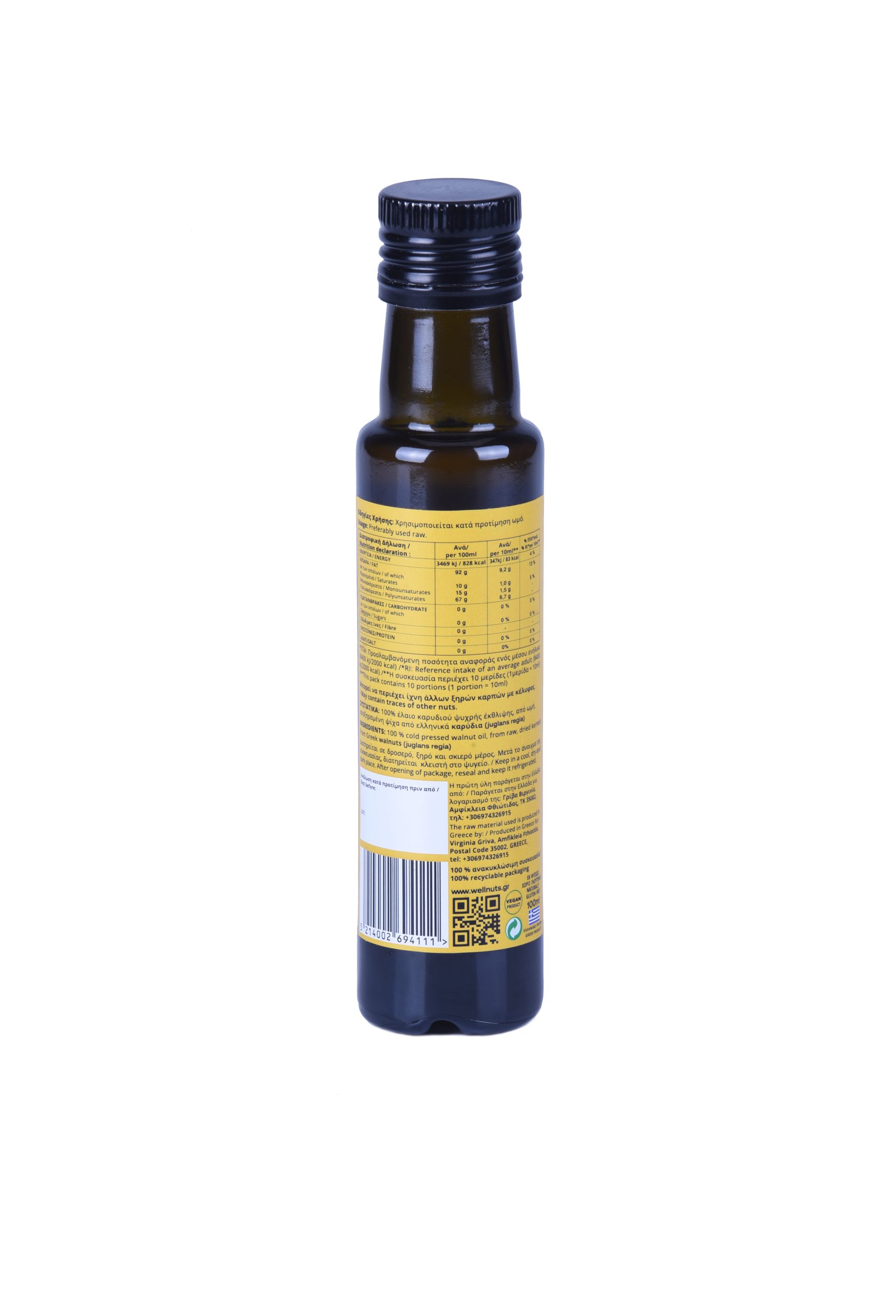 Το ωμό, βρώσιμο καρυδέλαιο ψυχρής έκθλιψης Wellnuts είναι 100% αγνό και φυσικό, χωρίς πρόσθετα, τεχνητά αρώματα/χρωστικές και συντηρητικά και προέρχεται από την ψυχρή έκθλιψη της ψίχας αποξηραμένων καρυδιών ελληνικής καλλιέργειας και ελληνικής καθαρής παραγωγής.