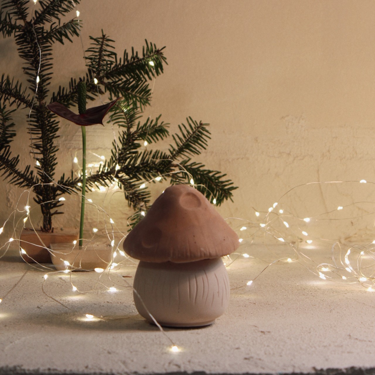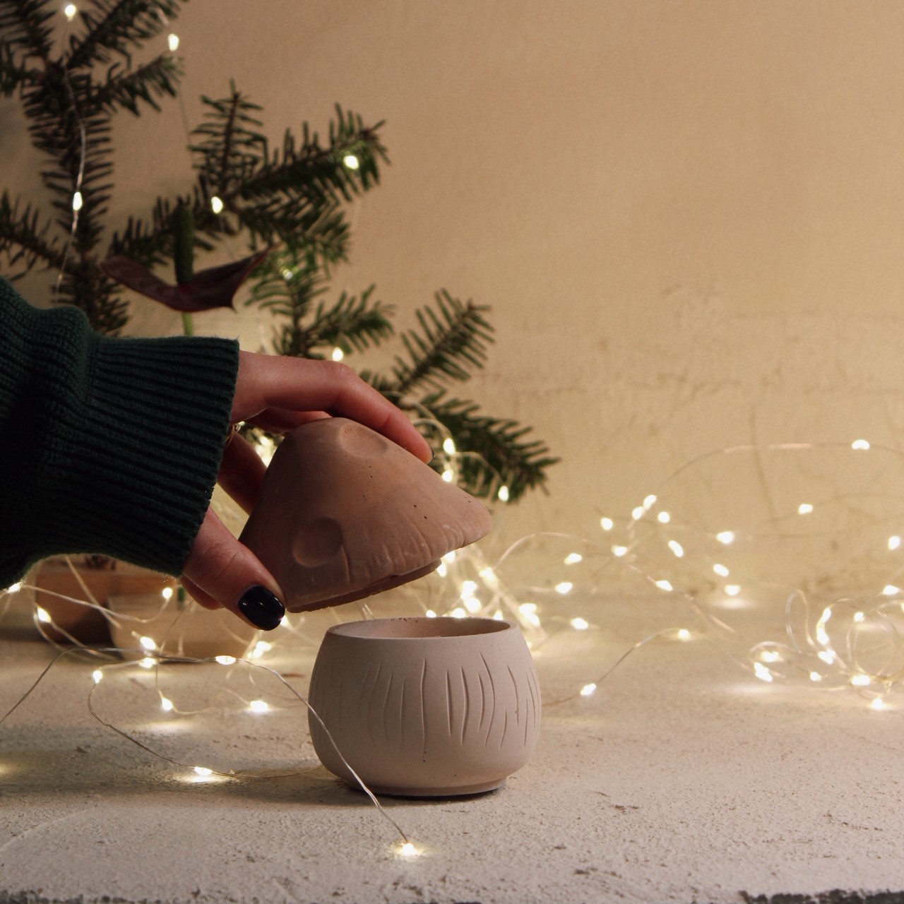 Τσιμεντένιο χειροποίητο χριστουγεννιάτικο δοχείο Mushroom pot με premium μείγμα φυτικού κεριού 70 γραμμαρίων και με οικολογικά ξύλινα φυτίλια.